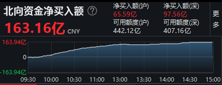 更加值得关注的是,今日北向资金表现尤为“给力”。继上周五净买入逾70亿元后,今日买入力度明显加大。截至收盘,北向资金全天大幅净买入163.16亿元,创年内次高;其中沪股通净买入65.59亿元,深股通净买入97.56亿元。