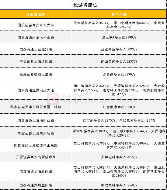 一线游资活跃度明显提升,机器人概念股南山智尚获三家一线游资席位买入;鸿蒙概念股天源迪科获三家一线游资席位买入,常山北明遭国投证券西安朱雀大街营业部卖出超8000万。