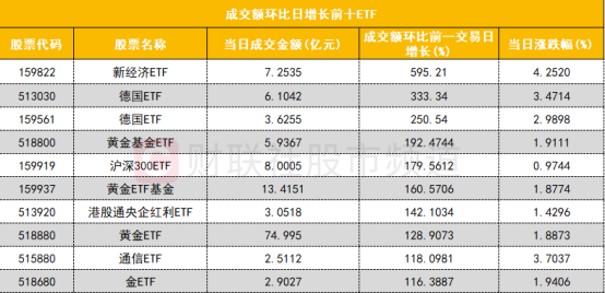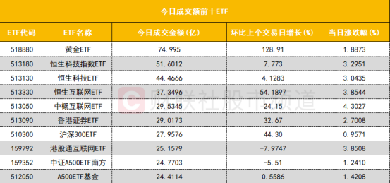 从成交额前十的ETF来看,黄金ETF(518880)成交额位居首位;恒生科技指数ETF(513180)成交额位居次席。