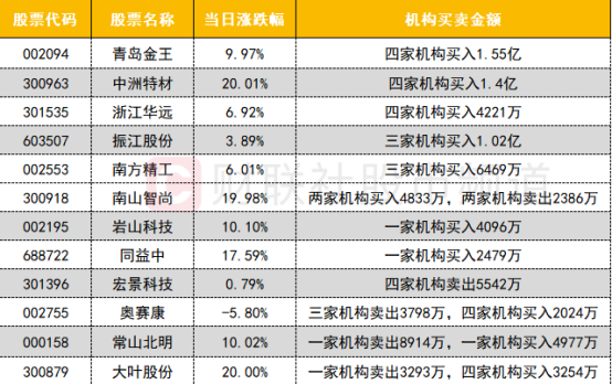 今日龙虎榜机构活跃度有所提升。买入方面,跨境支付概念股青岛金王获机构买入1.55亿;可控核聚变概念股中洲特材获机构买入1.4亿;机器人概念股振江股份获机构买入1.02亿。