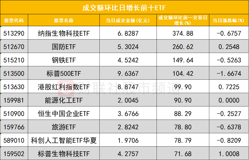 从成交额环比增长前十的ETF来看,纳指生物科技ETF(513290)成交额环比增长374%位居首位;国防ETF(512670)成交额环比增长260%位居次席。