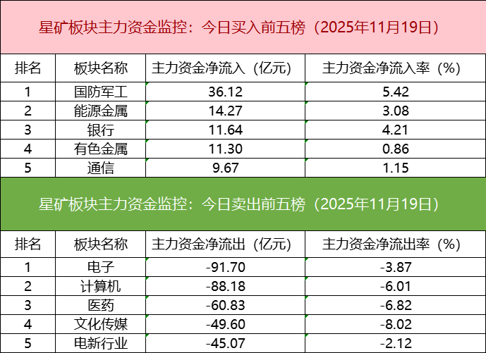 从主力板块资金监控数据来看,国防军工板块主力资金净流入居首。