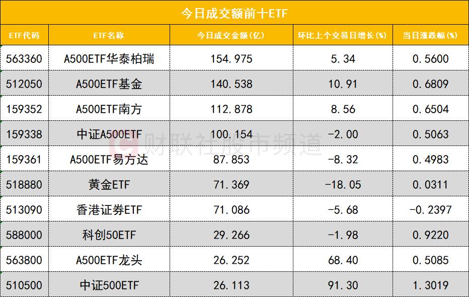 从成交额前十的ETF来看,A500ETF华泰柏瑞(563360)成交额位居首位,A500ETF基金(512050)成交额位居次席。