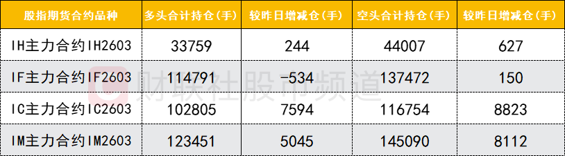 四大期指主力合约中,IH、IC、IM合约多空双方均加仓,IM、IC合约空头加仓数量较多。