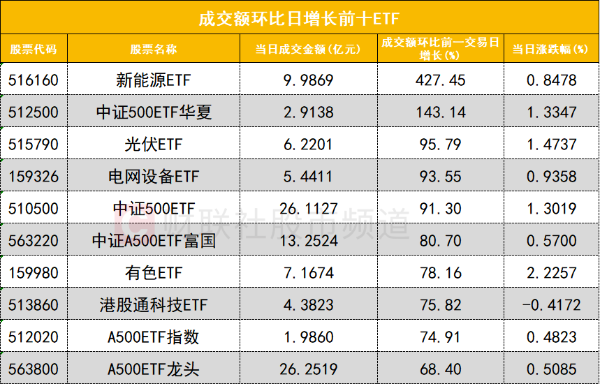 从成交额环比增长前十的ETF来看,新能源ETF(516160)成交额环比增长427%位居首位;中证500ETF华夏(512500)成交额环比增长143%位居次席。