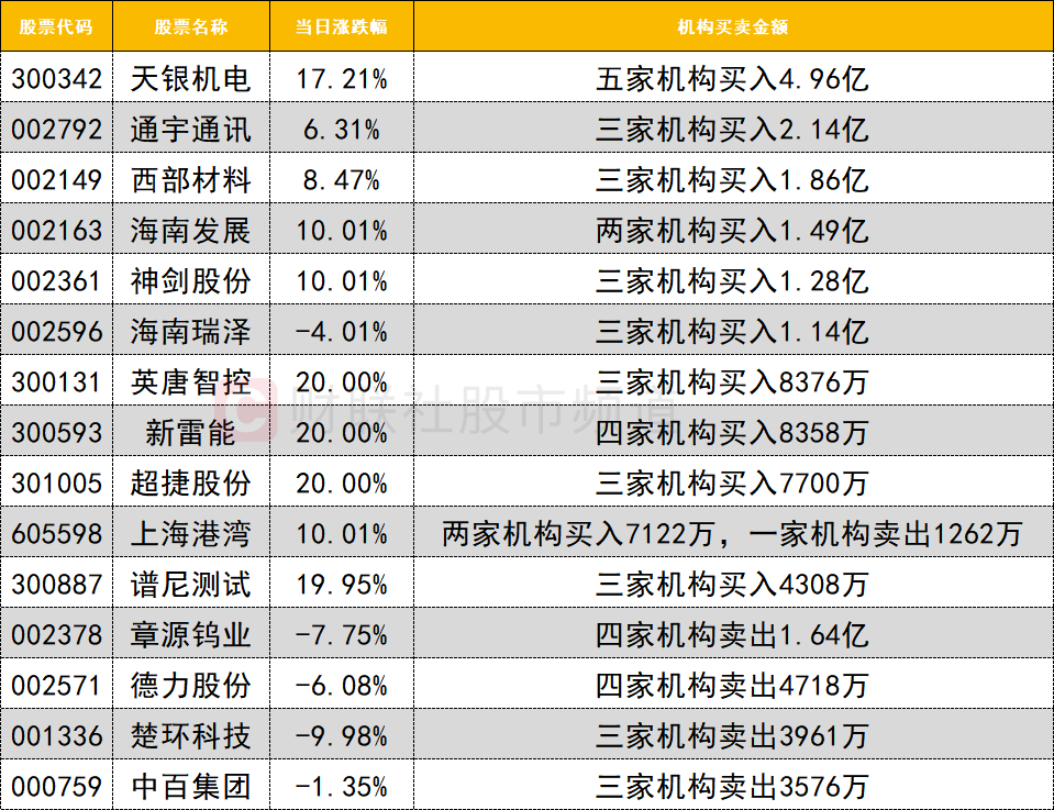 今日龙虎榜机构活跃度大幅提升,买入方面,多只商业航天概念股获机构抢筹,其中天银机电获五家机构买入4.96亿,通宇通讯获三家机构买入2.14亿,西部材料获三家机构买入1.86亿,神剑股份获三家机构买入1.28亿,超捷股份获三家机构买入7700万。