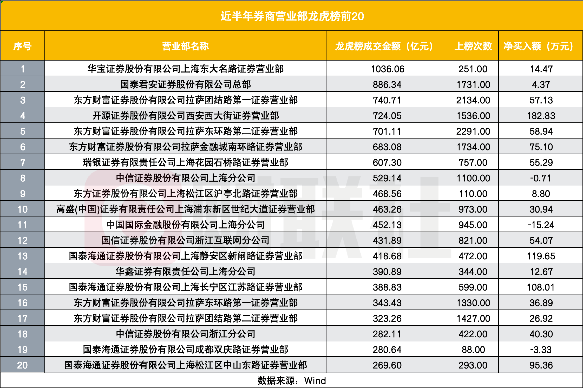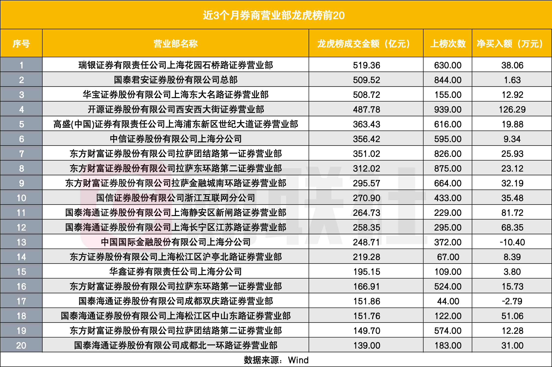 记者根据券商营业部近半年、近三个月、近一个月龙虎榜前20榜单数据,发现这样四大趋势: