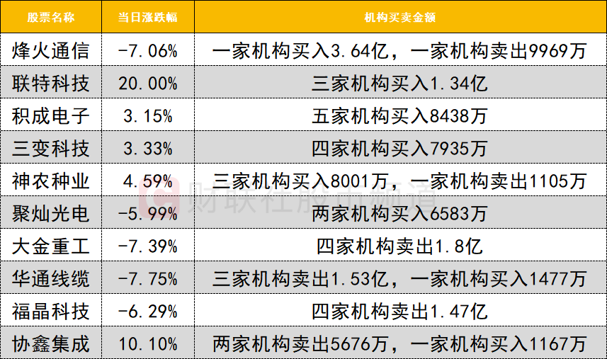 今日龙虎榜机构活跃度一般,联特科技20cm涨停创历史新高,获三家机构买入1.34亿。大金重工今日低开低走,遭四家机构卖出1.8亿。