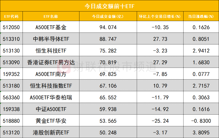 从成交额前十的ETF来看,A500ETF基金(512050)成交额位居首位,中韩半导体ETF(513310)成交额位居次席。