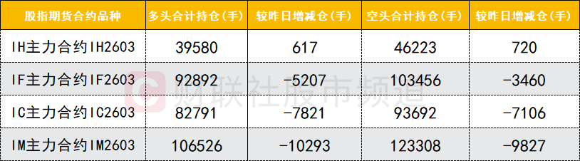 四大期指主力合约中,IF、IC、IM合约多空双方均减仓,IF合约多头减仓数量较多。IH合约多空双方均加仓。