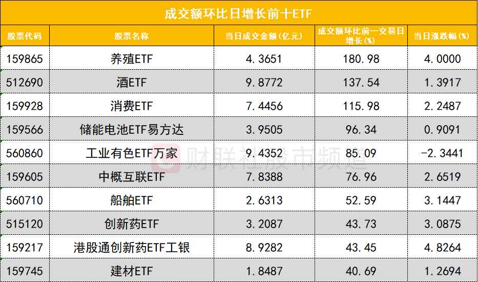 从成交额环比增长前十的ETF来看,养殖ETF(159865)成交额环比增长180%位居首位;酒ETF(512690)成交额环比增长137%位居次席。