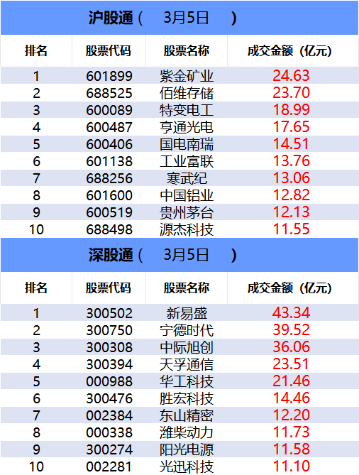 从沪股通前十大成交个股来看,紫金矿业位居首位;佰维存储和特变电工分居二、三位。