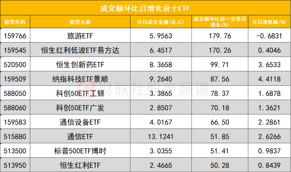 从成交额环比增长前十的ETF来看,旅游ETF(159766)成交额环比增长179%位居首位;恒生红利低波ETF易方达(159545)成交额环比增长170%位居次席。