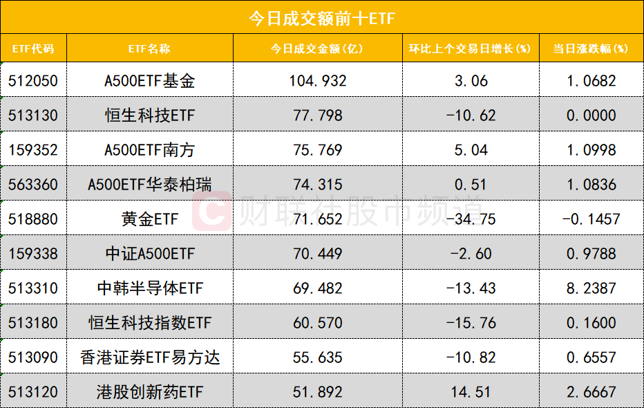 从成交额前十的ETF来看,A500ETF基金(512050)成交额位居首位,恒生科技ETF(513130)成交额位居次席。