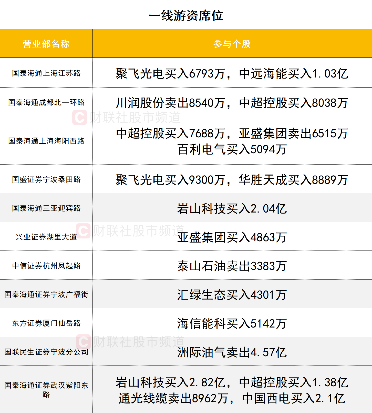 一线游资活跃度一般,岩山科技获两家一线游资(国泰海通证券武汉紫阳东路、国泰海通证券三亚迎宾路)合计买入4.86亿。