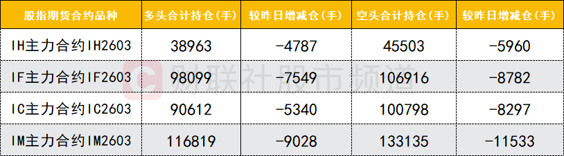 四大期指主力合约中,IH、IF、IC、IM合约多空双方均减仓,空头减仓数量较多。