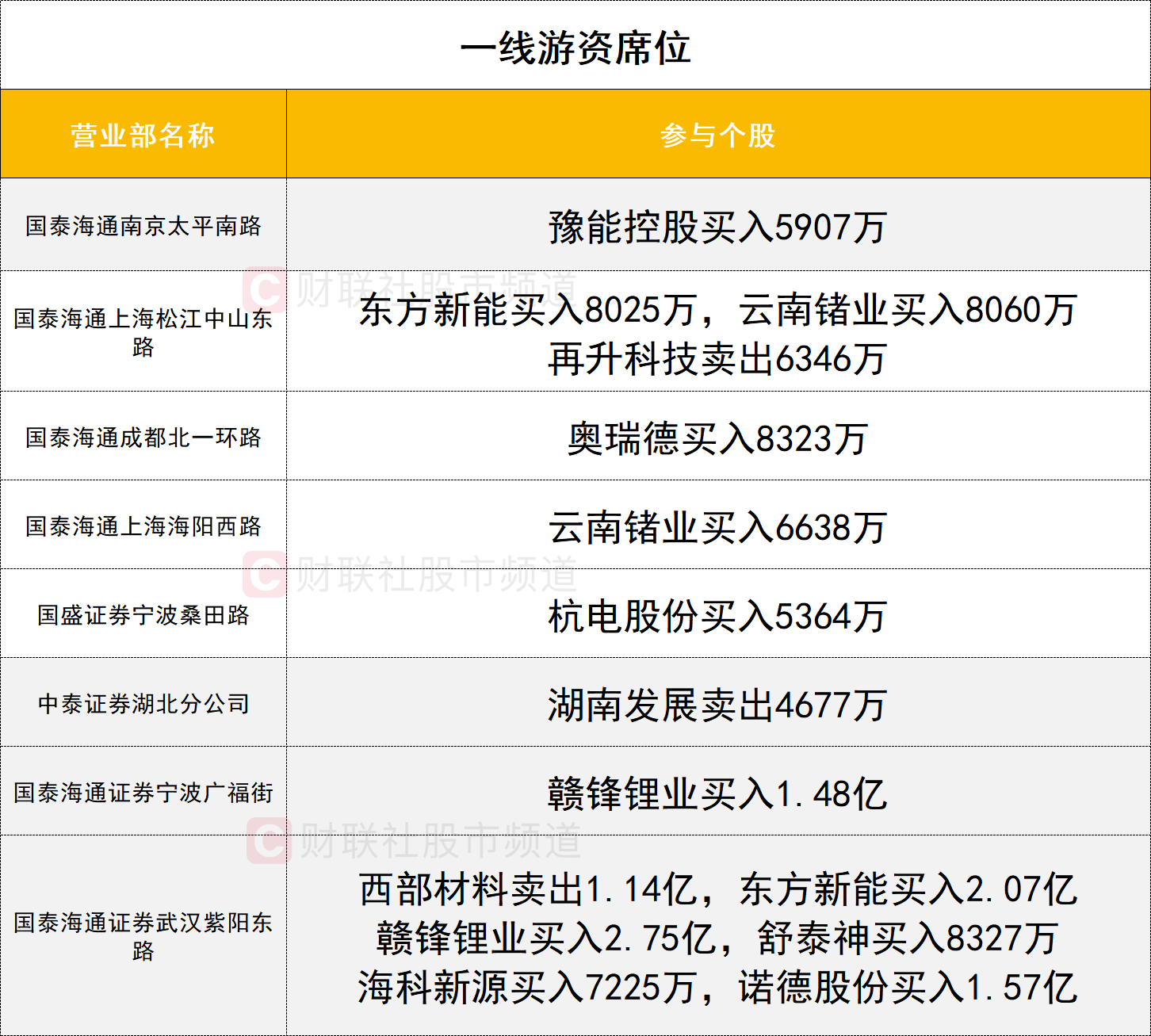 一线游资活跃度有所提升,锂矿人气股赣锋锂业获两家游资(国泰海通证券武汉紫阳东路、国泰海通证券宁波广福街)合计买入4.23亿。东方新能强势涨停,获两家游资(国泰海通证券武汉紫阳东路、国泰海通证券上海中山东路)合计买入2.87亿。