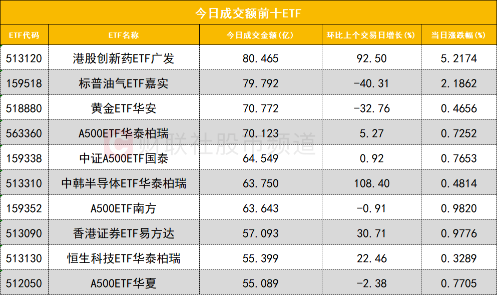 从成交额前十的ETF来看,港股创新药ETF广发(513120)成交额位居首位,标普油气ETF嘉实(159518)成交额位居次席。