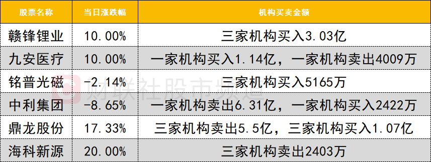 今日龙虎榜机构活跃度一般,电池产业链集体爆发,赣锋锂业涨停,获三家机构买入3.03亿,同时深股通买入0.79亿。九安医疗获一家机构买入1.14亿,同时遭一家机构卖出0.4亿。太空光伏概念股中利集团触及跌停,遭一家机构大幅卖出6.31亿。