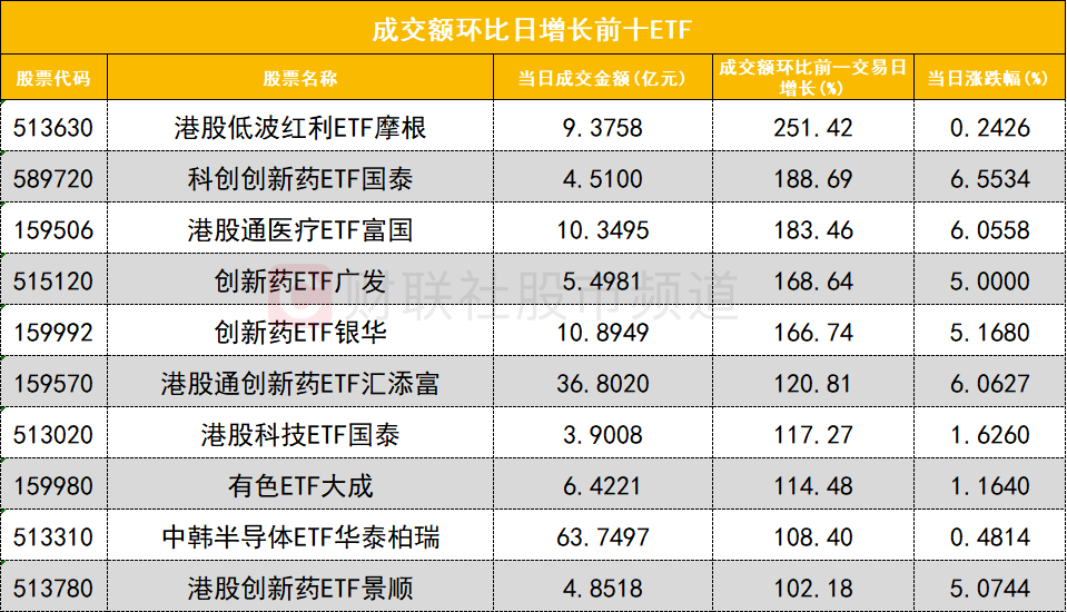 从成交额环比增长前十的ETF来看,港股低波红利ETF摩根(513630)成交额环比增长251%位居首位;科创创新药ETF国泰(589720)成交额环比增长188%位居次席。