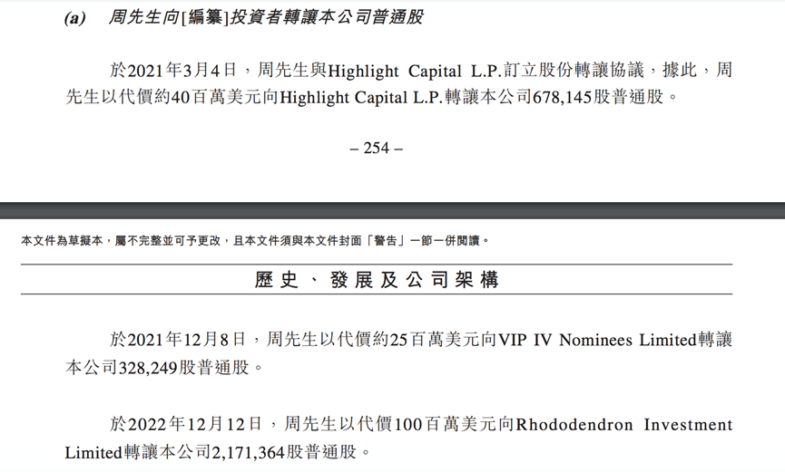 值得注意的是一个细节的是,此前在2024年10月份招股书中,周胜馥在2021年至2022年三次转让公司股份,分别以4000万美元、2500万美元和1亿美元成交,合计1.65亿美元。