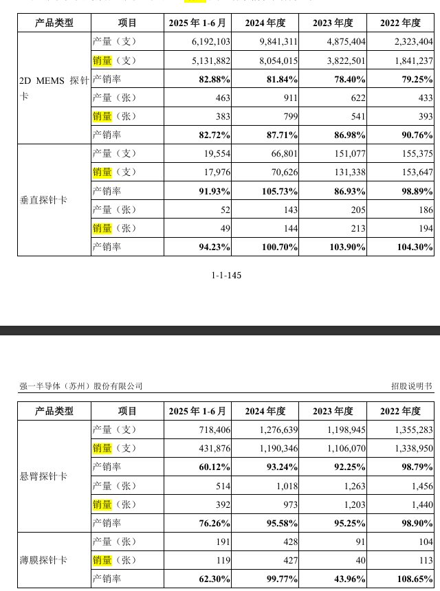 从强一股份现有销售情况来看,2025年上半年,强一股份2D MEMS探针卡的销售数量仅为513.19万支,现有销量尚且无法完全消化当前产能,产销率为82.88%。该公司表示,2025年1-6月,公司各类产品产销率相对较低,主要系公司在手订单充足、期末发出商品金额较大所致。