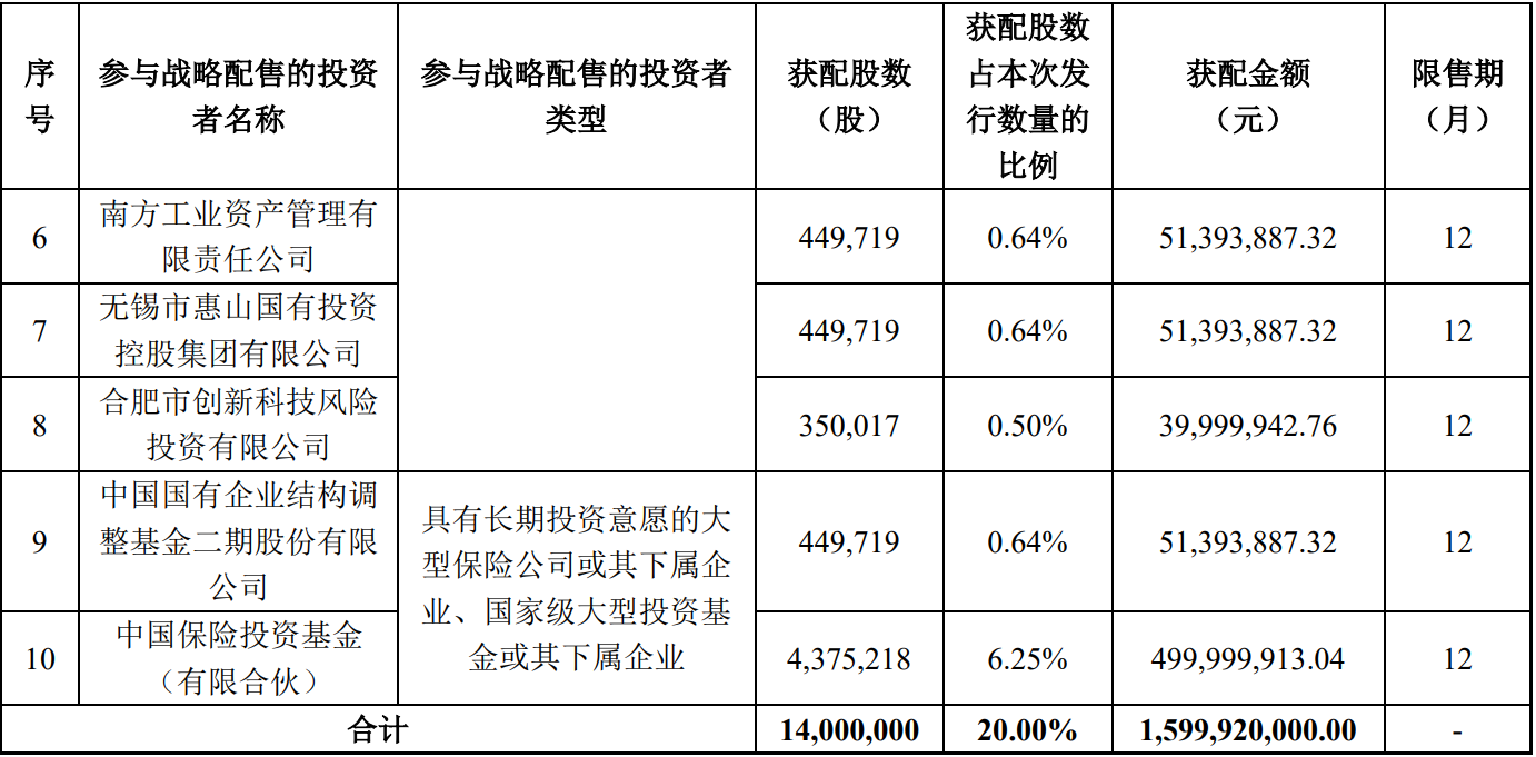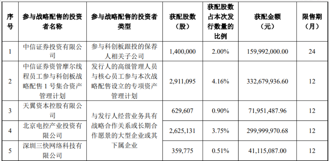 经确认,《发行公告》中披露参与战略配售的投资者参与本次发行的战略配售有效。本次发行最终战略配售结果如下。中签结果如下:
