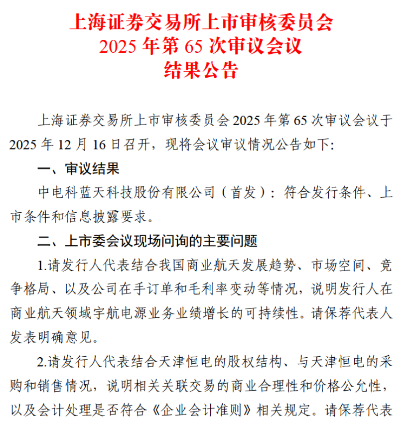 其中,在上市委会议现场,该公司被问及的主要问题包括:结合我国商业航天发展趋势、市场空间、竞争格局、以及公司在手订单和毛利率变动等情况,说明公司在商业航天领域宇航电源业务业绩增长的可持续性等。