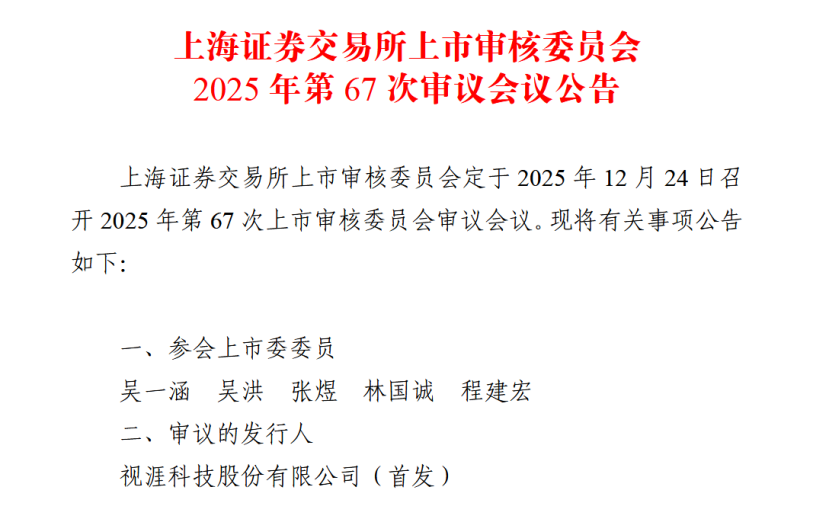 12月17日,上交所官网显示,上市委2025年第67次审议会议将于12月24日召开,视涯科技的首次公开发行申请将在此次会议上接受审核。