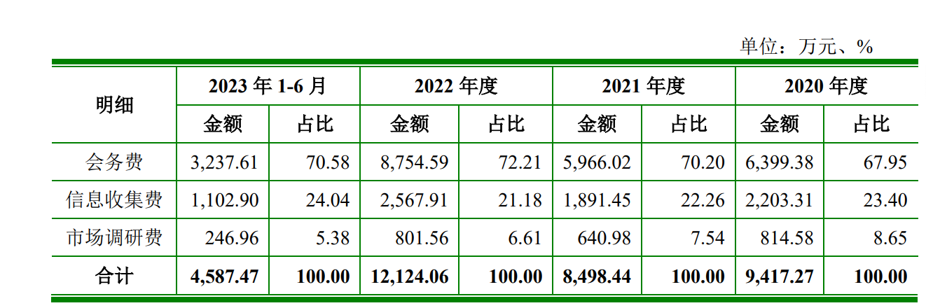 2020年-2023年上半年,知原药业产生的会务费分别是6399.38万元、5966.02万元、8754.59万元、3237.61万元;信息收集费分别是2203.31万元、1891.45万元、2567.91万元、1102.90万元;市场调研费分别是814.58万元、640.98万元、801.56万元、246.96万元。
