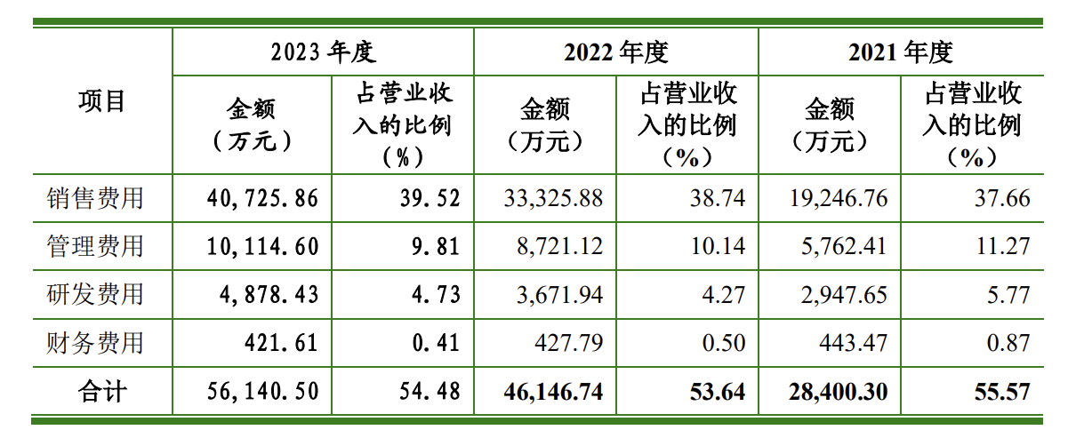 《科创板日报》记者注意到,2020年-2022年,知原药业的销售费用(由市场推广费、职工薪酬、差旅费、业务招待费、仓储服务费及其他构成)分别为1.46亿元、1.92亿元、3.33亿元,占营收比重分别为37.72%、37.66%、38.74%。