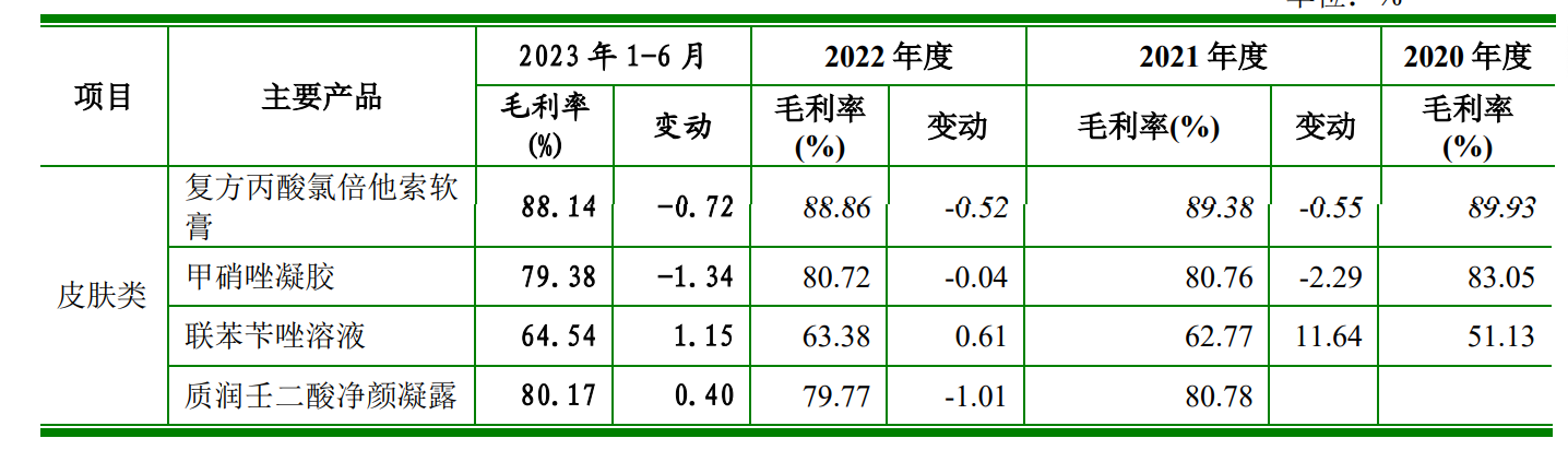 另值得一提的是,皮肤病药物相比于其他化学药品,通常单价较低但利润率高。据知原药业招股书显示,2021年-2023年,其皮肤类产品的总体毛利率均在73%以上,而诸如复方丙酸氯倍他索软膏这类单品的毛利率更是在88%以上。