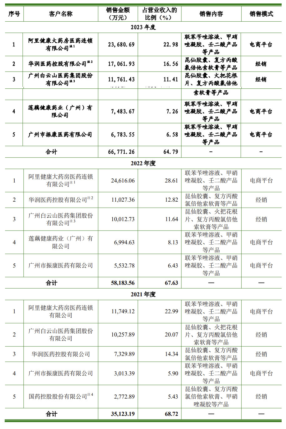 其中,广州白云山既是知原药业前五大客户,又是前五大供应商。2020年,广州白云山既为第一大客户,也是第一大供应商;2021年-2023年,广州白云山分别为第二、第三、第三大客户,期间销售额在1亿元左右规模,同时均为第一大供应商。