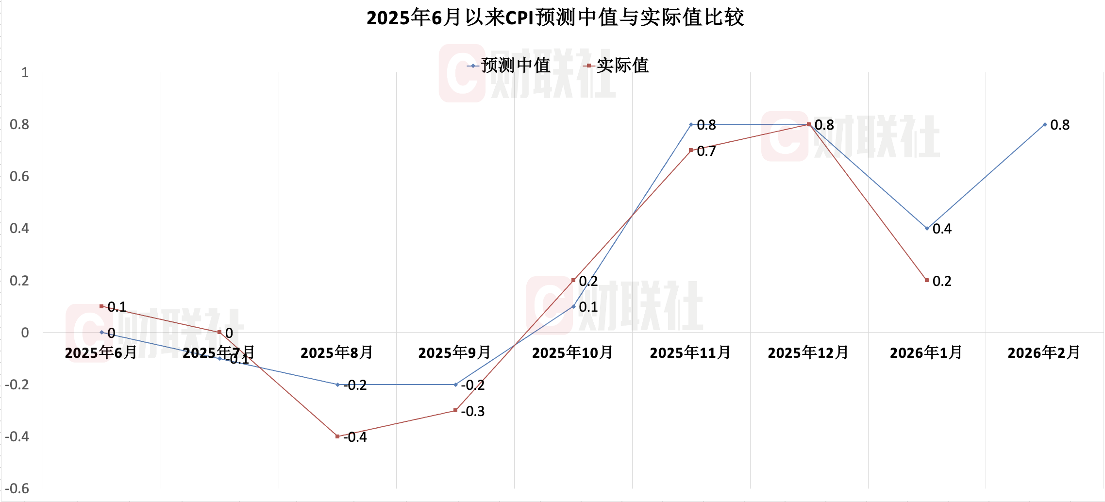 1月CPI同比上涨0.2%,低于2025年12月0.6个百分点,当月扣除食品和能源价格的核心CPI同比增速放缓0.4个百分点至0.8%。从同比读数来看,市场机构对2月CPI的预测中值为0.8%,预测区间为0.7%至0.9%。
