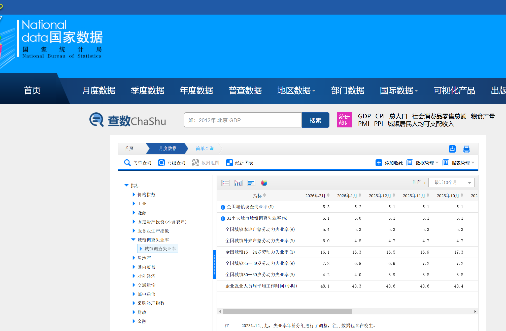 【国家统计局发布2026年2月份分年龄组失业率数据】财联社3月19日电,国家统计局发布布2026年2月份分年龄组失业率数据。2月份,全国城镇不包含在校生的16-24岁劳动力失业率为16.1%,不包含在校生的25-29岁劳动力失业率为7.2%,不包含在校生的30-59岁劳动力失业率为4.2%。