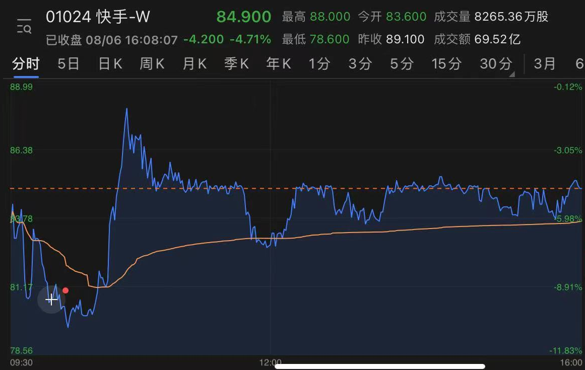 今日,快手盘中一度跌超10%,股价再创上市以来新低。截至收盘,报84.90港元,跌4.71%,总市值为3531.97亿港元。此前,快手市值最高曾达1.7万亿港元,半年时间里公司蒸发的市值相当于一个美团(1.31万亿港币)的市值。