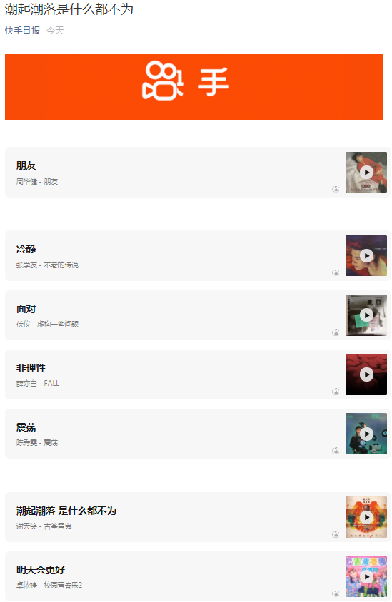今日午间,“快手日报”发布了《潮起潮落是什么都不为》一文,文章包含了几首歌曲和一长串重复文字。其中,把所有歌曲名字连起来为“朋友冷静面对非理性震荡,潮起潮落是什么都不为,明天会更好”。