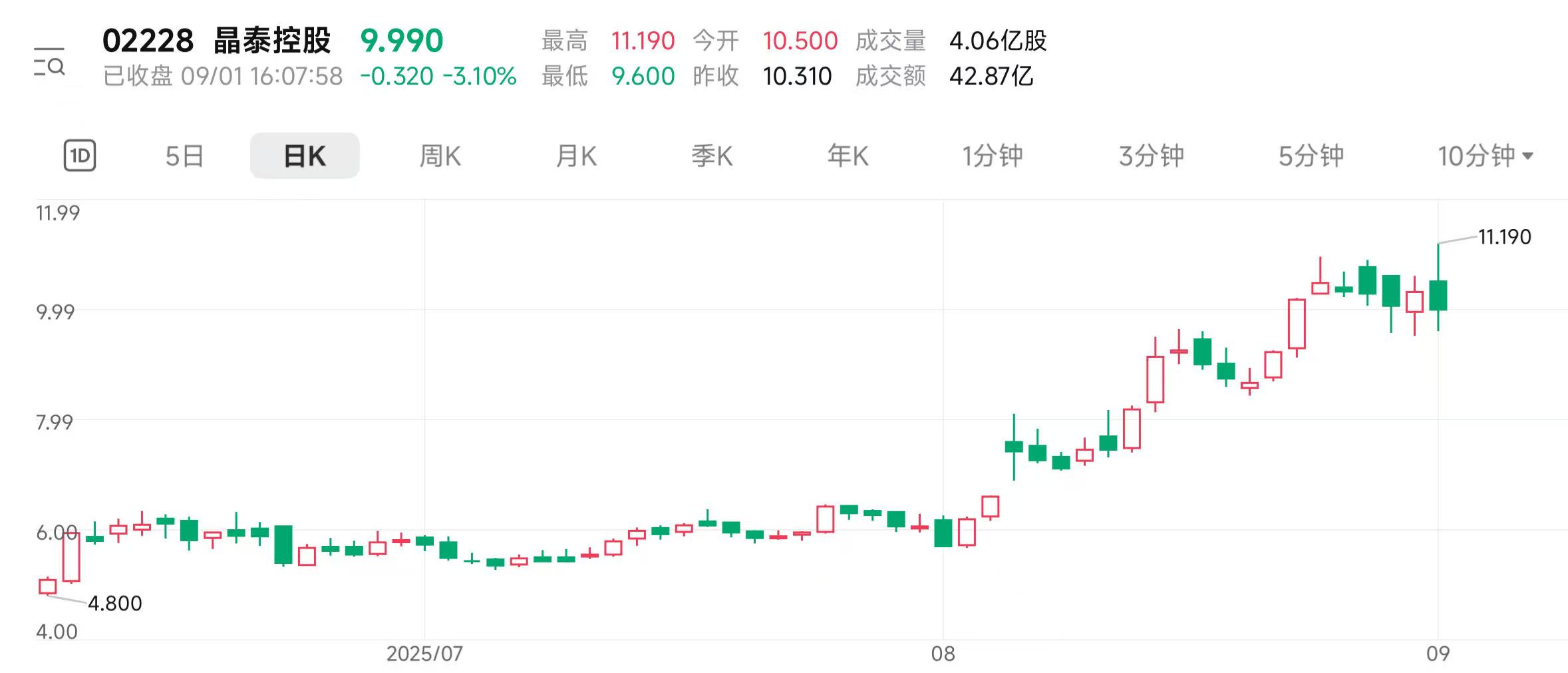 9月1日讯(编辑 冯轶)今日,头顶AI医疗概念的晶泰控股(02228.HK)在完成一笔超26亿港元的高位配售后,股价出现波动。盘中最高涨超8%后尾盘跳水,最终收跌3.10%。