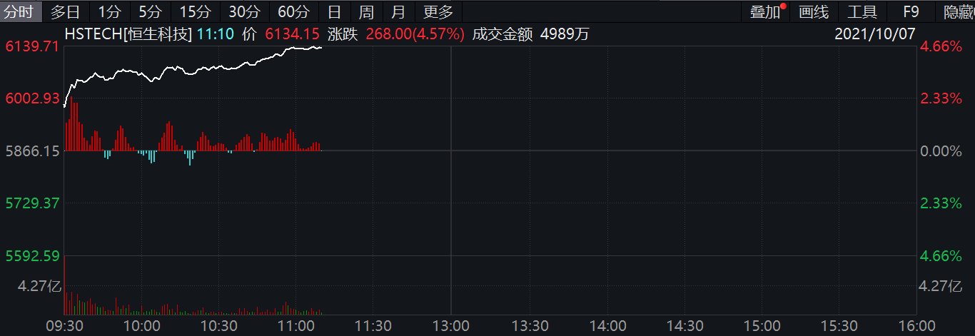 (上海,郑远方)讯,今日上午,恒生指数涨逾2%,恒生科技指数涨超4.5%。盘中网易涨超10%,快手涨超8%,美团涨超7%,阿里巴巴涨超6%。
