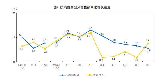 按消费类型分,10月份,商品零售额41092亿元,同比增长2.8%;餐饮收入5199亿元,增长3.8%。1—10月份,商品零售额365981亿元,增长4.4%;餐饮收入46188亿元,增长3.3%。