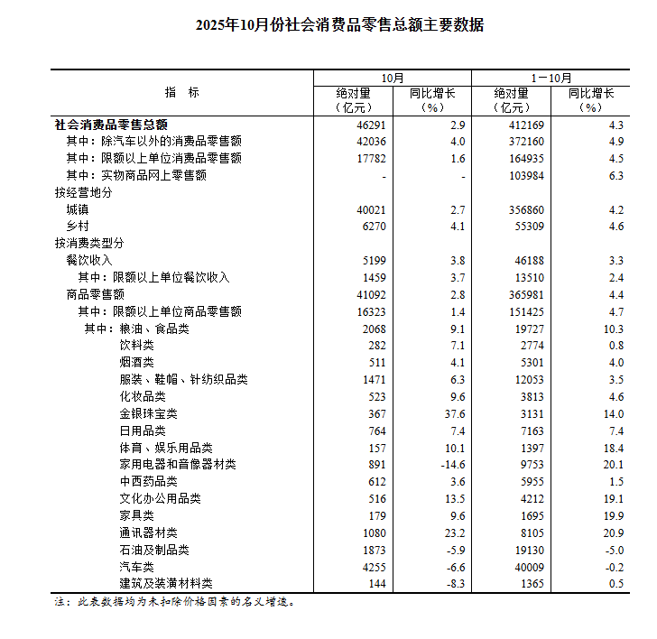 10月份,社会消费品零售总额46291亿元,同比增长2.9%。其中,除汽车以外的消费品零售额42036亿元,增长4.0%。1—10月份,社会消费品零售总额412169亿元,增长4.3%。其中,除汽车以外的消费品零售额372160亿元,增长4.9%。