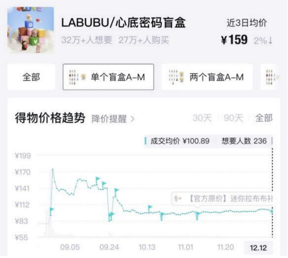 8月28日发售的心底密码系列搪胶毛绒挂件(简称“心底密码”)“降温”更为迅速,得物APP数据显示,单个盲盒成交均价发售第二天达174.9元峰值后,次日便开始下降,截至12月31日,已经降至97.1元,仅为官方发售价格的1.2倍。