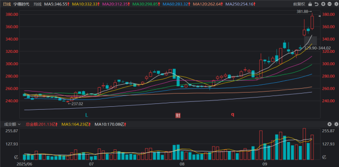 作为新能源赛道中的“市值一哥”,宁德时代的股价动向一直倍受投资者所关注。自8月中旬以来,宁德时代股价展开快速攀升,截至今日收盘,其近1个月累计涨幅近35%,在一众万亿市值股中涨幅位居第二,仅次于工业富联(36.25%)。受持续拉涨提振,宁德时代近期的股价位次也不断提升,以今日收盘价统计,其以377.10元的规模位居整个市场第9位。