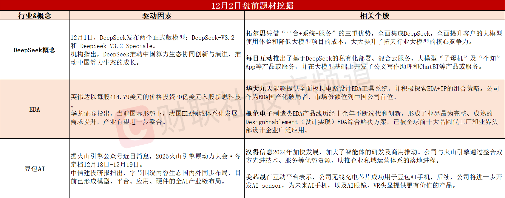 【盘前题材挖掘】①DeepSeek发布两款新模型,有望加速国产AI软硬件生态闭环。②英伟达豪掷20亿美元入股新思科技,EDA产业链有望迎来强催化。③火山引擎FORCE原动力大会本月召开,机构建议关注字节AI产业链。