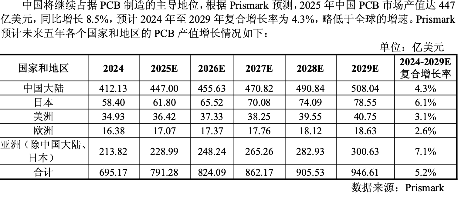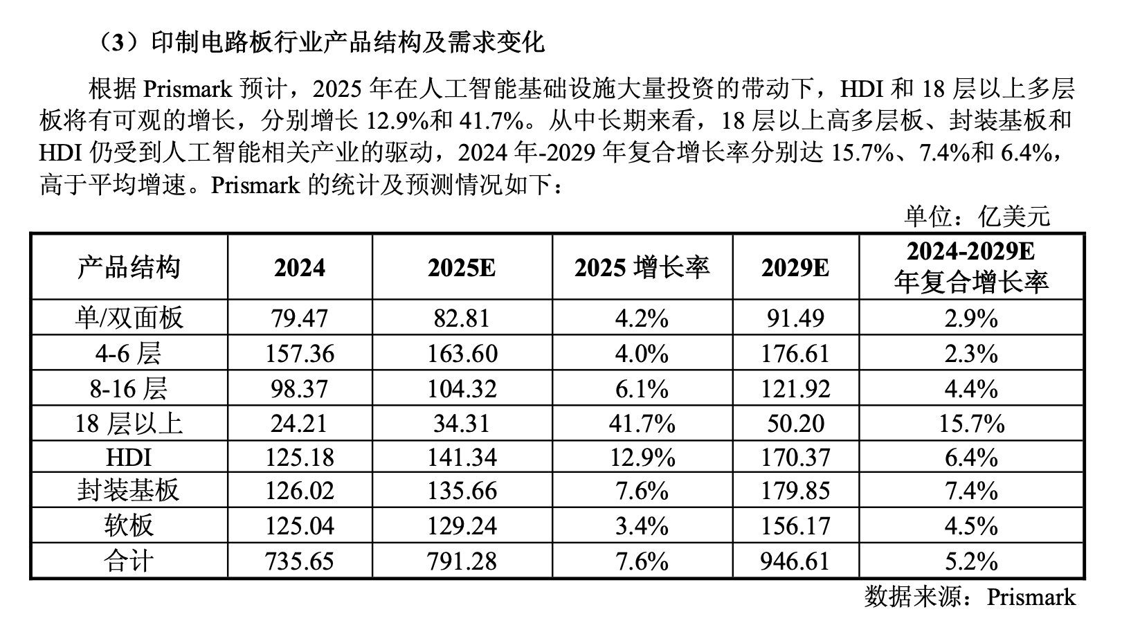生益电子亦在2025年半年报中提到,AI产业快速发展足以支撑PCB市场的增长,预计2025年全球PCB市场产值增长7.6%,达791.28亿美元。从中长期来看,全球PCB行业在2024年至2029年复合增长率为5.2%,仍呈现稳定增长趋势。