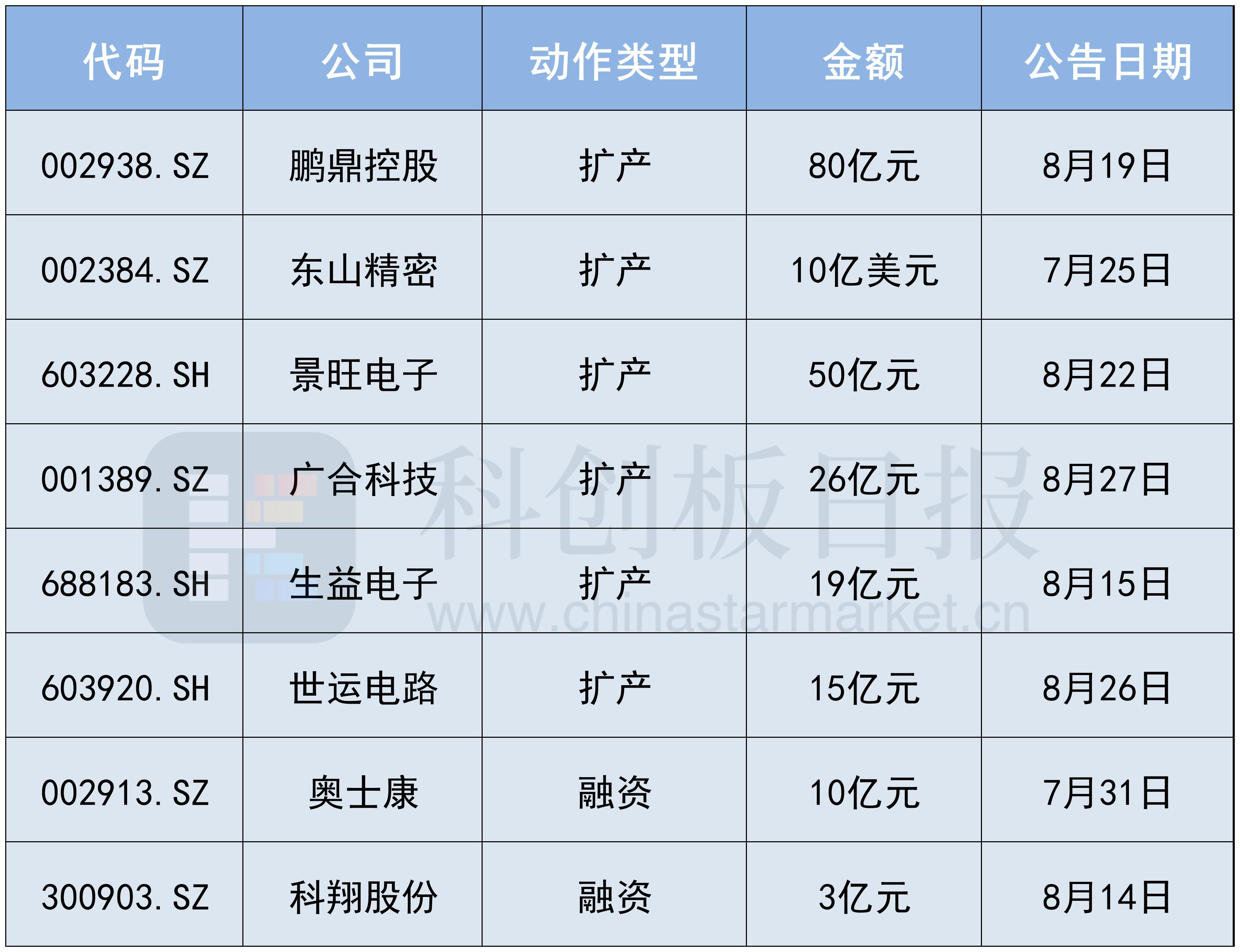 在上述计划中,鹏鼎控股拟投资金额最大,高达80亿元。公告显示,公司计划在淮安园区建设包括SLP、高阶HDI及HLC等产品产能及扩充软板。而即便是拟融资金额最小的科翔股份,其定增募资计划也多达3个“小目标”。