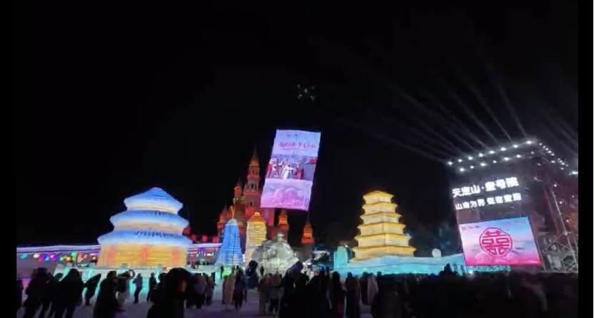 飘落的细碎雪花与灯光交相辉映,织就一幅兼具科技感与诗意的立体冰雪画卷。往来游客纷纷驻足,指尖轻按快门,将这份冰雪与科技交织的浪漫瞬间,定格成马年春节最珍贵的回忆。