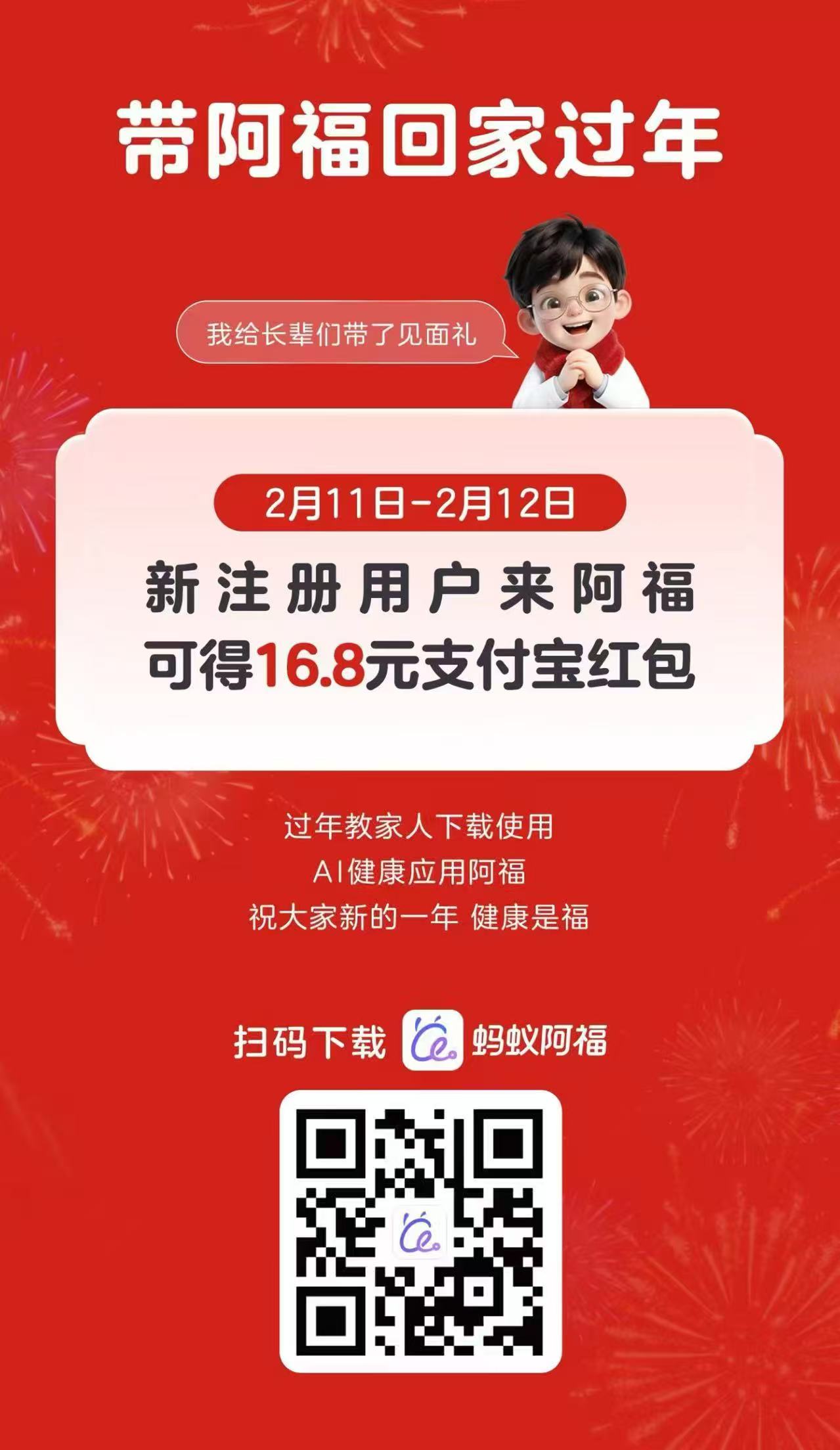 值得一提的是,蚂蚁阿福今日还推出一项新引流活动,2月11日至2月12日期间的新注册用户,可获得16.8元的支付宝红包,进一步吸引未注册用户参与,关注AI健康服务,抢抓春节节日流量。