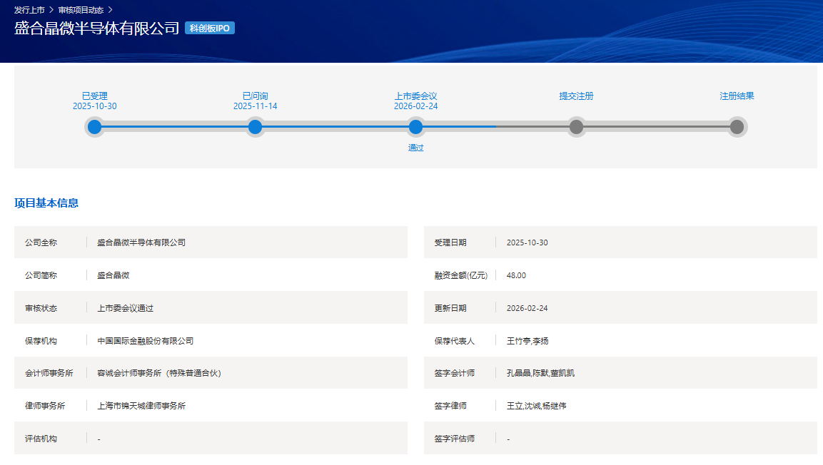 《科创板日报》2月24日讯(记者 陈俊清) 上交所上市审核委员会今日(2月24日)审议通过了盛合晶微科创板IPO申请。该公司上市申请于2025年10月30日获受理,经历两轮问询后,成为2026春节后第一家过会企业。