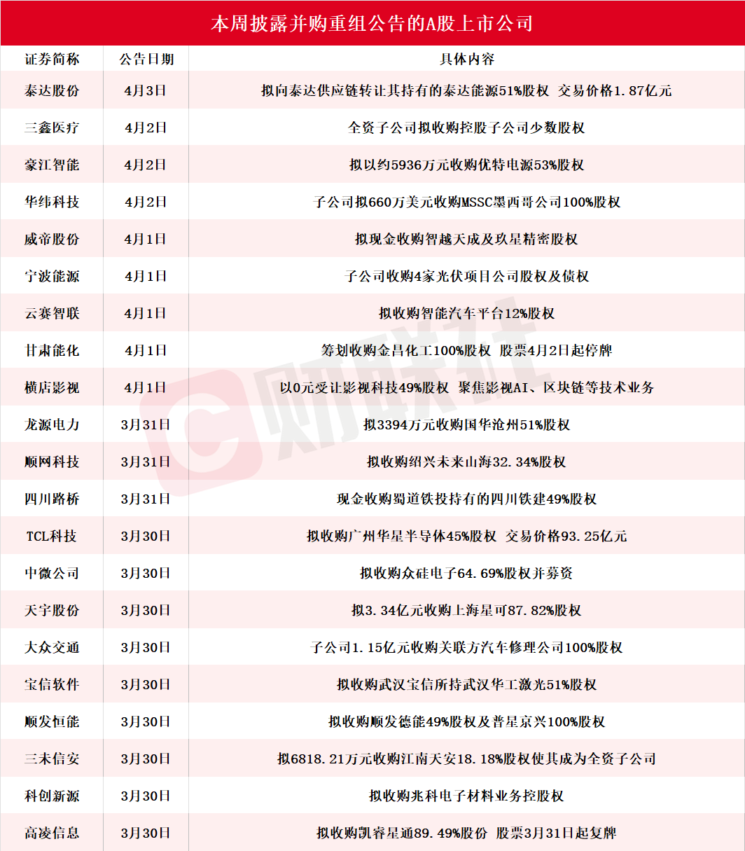 据不完全统计,截至发稿,本周披露并购重组进展的A股上市公司共有21家,包括泰达股份、三鑫医疗、豪江智能、华纬科技、威帝股份、宁波能源、云赛智联、甘肃能化、横店影视、龙源电力、顺网科技、四川路桥、TCL科技、中微公司、天宇股份、大众交通、宝信软件、顺发恒能、三未信安、科创新源、高凌信息。具体情况如下图: